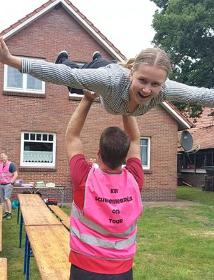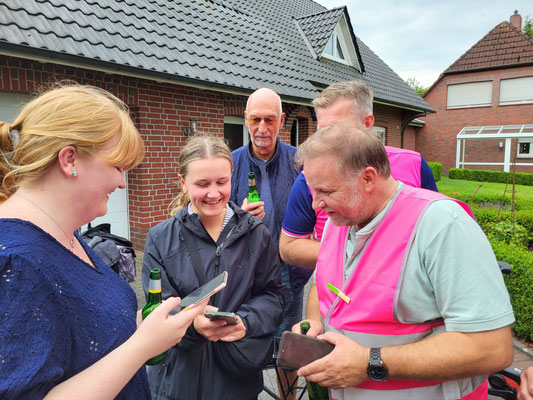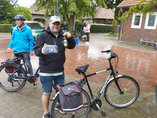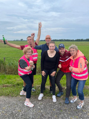 Wie schon in den beiden Jahren zuvor hatte sich das Orga-Komitee eine schöne Route durch Friesland überlegt. Es ging durch Zetel, am Freibad vorbei nach Steinhausen, dann weiter über Ellenserdamm nach Dangast, wo schließlich Rhabarberkuchen und Bowle auf die Radler wartete. Zwischendurch wurden Spiele gespielt oder kleine Schluck-Pausen eingelegt. Nachdem sich alle mit Kuchen, Kaffee und Getränken gestärkt hatten, führte die Tour weiter nach Rotenhahn über Brunne und endete schließlich in Neuenburg bei Mythos. Trotz kleinerer Regenschauer zwischendurch waren alle in bester Stimmung und die Teams legten sich bei den verschiedenen Spielen kräftig ins Zeug. Jeder Teilnehmer hatte außerdem eine Fotoaufgabe erhalten und so wurden nicht nur Pyramiden gebaut und Laola-Wellen initiiert. Die Schweinebrücker fanden sich auch in einer imaginären Geisterbahn wieder oder bejubelten im Team einen Schoet.